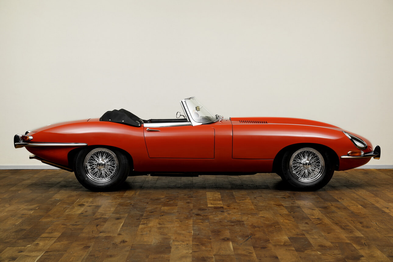The Jaguar E-Type was presented at the Geneva Motor Show in March 1961 and was considered a sensation at the time. Both the design by Malcom Sayer and the engine received a very positive response. The attraction of the E-Type lay in its driving performance, its design and charisma combined with its favourable price – especially in comparison to significantly more expensive sports cars from Aston Martin and Ferrari. Accordingly, the E-Type was also a complete success for Jaguar in terms of sales. Right from the start, the model was available as a coupé with the distinctive side-opening tailgate and as a roadster (Open Two Seater, OTS).
