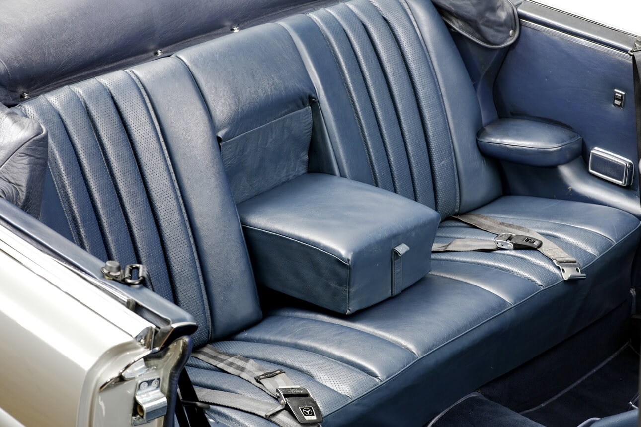 Dieses Mercedes Benz 280 SE 3,5 Cabriolet wurde im Juli 1971 in in die Vereinigten Staaten ausgeliefert und zugelassen. Der Datenkarte von Mercedes Benz zur Auslieferungsspezifikation und Ausstattung liegen vor. Das originale Farbschema in silber-metallic (bei Auslieferung laut Datenkarte DB 180 silbergrau-metallic) mit einem Interieur in blauem Leder sowie einem Verdeck in dunkelblau ist sehr klassisch-elegant. Das Interieur (DB Code 245) dürfte sich im Originalzustand befinden – es ist sehr gut erhalten und weist eine ganz leichte Patina auf.