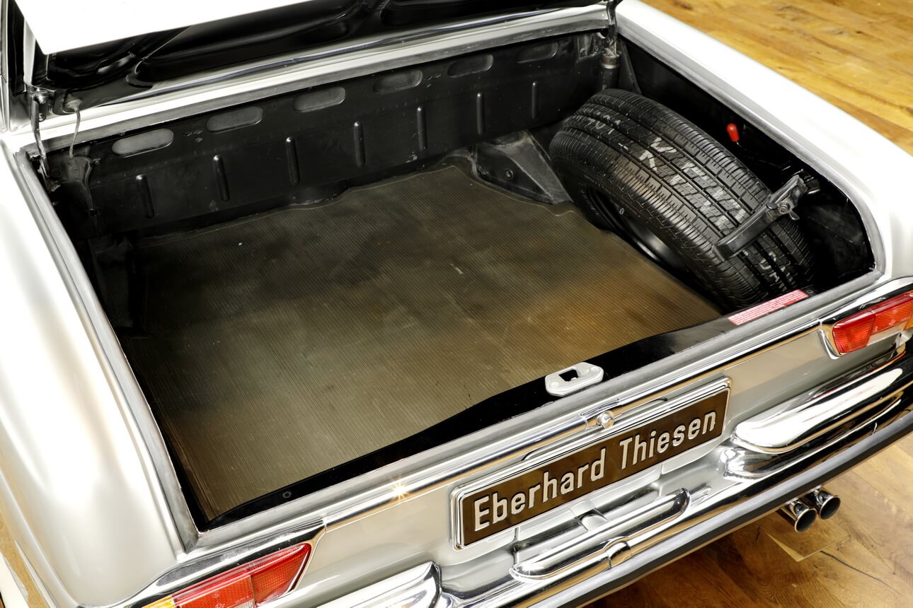 Für eine optische und technische Optimierung sind 2021/2022 weitere Arbeiten in den Wagen investiert worden. Im Zuge der Karosserieinstandsetzung wurden beide hintere Radläufe großflächig ausgeschnitten und mit neuen Blechen versehen. Das Heckmittelstück ist komplett durch ein originales Mercedes-Benz Ersatzteil ersetzt worden. Der vordere rechte Schweller war bereits in den USA erneuert worden. Ansonsten war und ist das Fahrzeug rostfrei. Der Motor ist original („Matching Numbers“) und hier in Deutschland komplett revidiert worden. Der Saugrohrdruckfühler und der Computer für die D-Jetronic wurden bei Bosch überholt. Darüber hinaus sind die Vorder- und Hinterachse mit allen Lagergummis, die Motorlager und die Bremsanlage mit allen Bremssätteln, die Auspuffanlage, die originale Behr Klimaanlage sowie das Servo-Lenkgetriebe bei Fachbetrieben instandgesetzt bzw. überholt worden. Eine vollständige Übersicht der durchgeführten Arbeiten sowie die Rechnungen hierzu für über 25.000 EUR liegen vor. Ebenso die TÜV-Erteilung, eine deutsche H-Zulassung und der frühere US-Title.