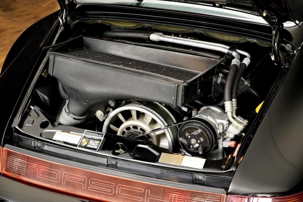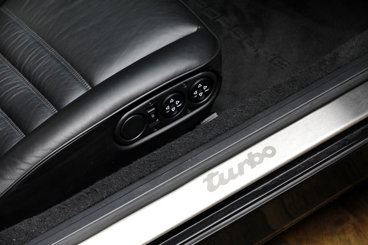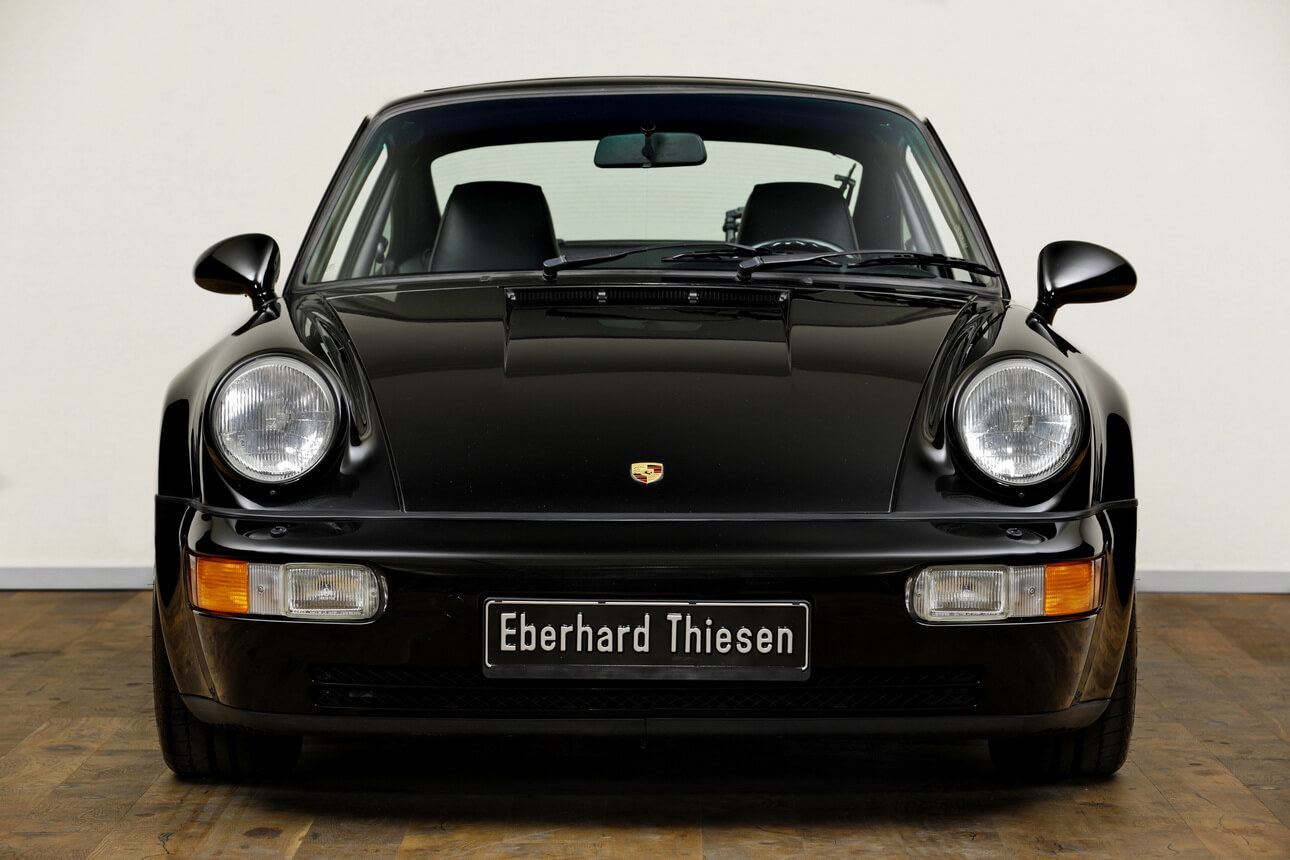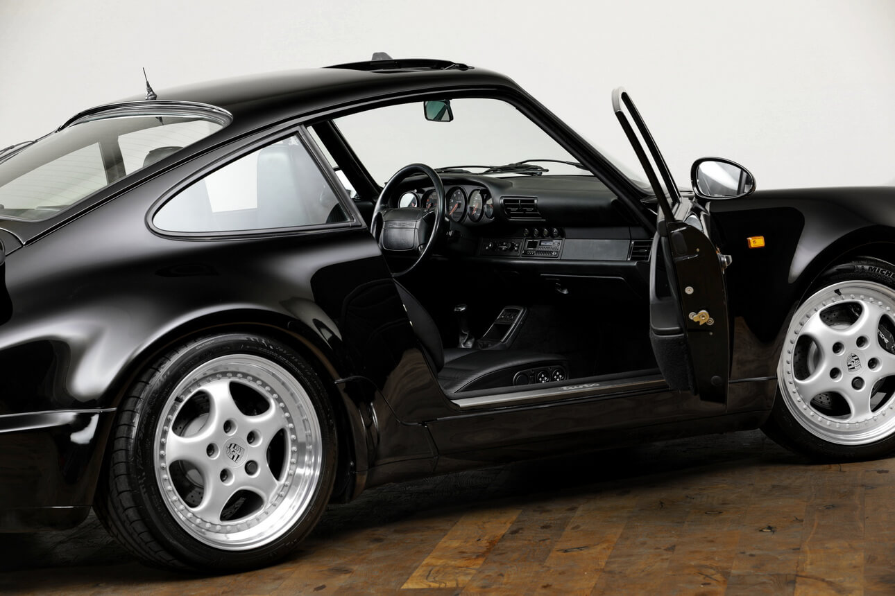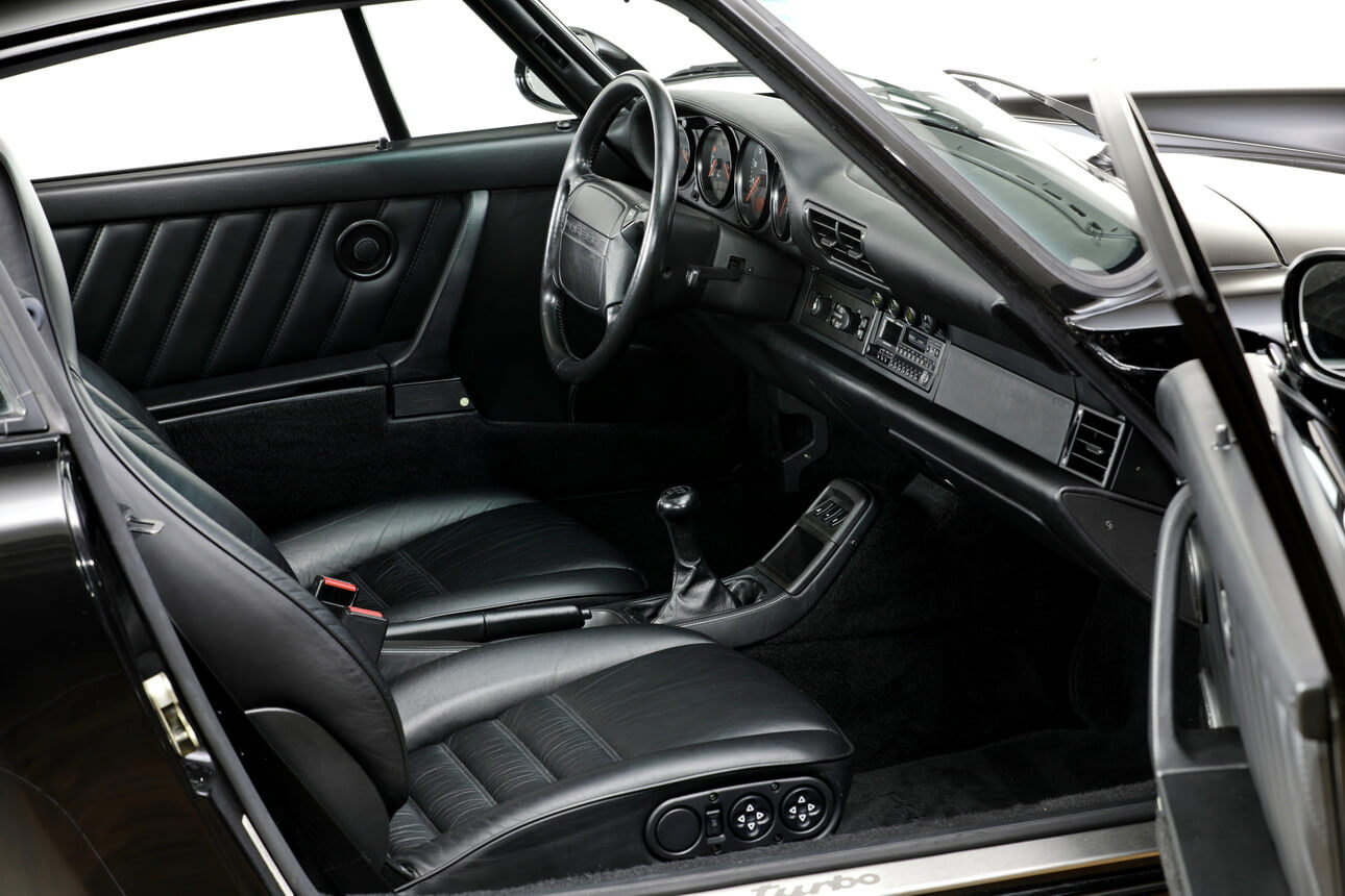 Dieser Porsche 964 Turbo wurde laut vorliegendem Service-Heft am 8. April 1993 über das Porsche Zentrum Kurpfalz Ernst Islinger in Mannheim ausgeliefert. Er verfügt über die besondere Ausstattung der Werksleistungssteigerung (WLS, Code X33), die 355 PS statt der serienmäßigen 320 PS leistet. Insgesamt wurden nur 192 Exemplare des 964 Turbo 3.3 mit WLS ausgeliefert. Das originale Farbschema in schwarz-metallic (Farbcode 738) mit einer Lederausstattung in schwarz trägt der Sportwagen noch heute, wobei die Lackierung überwiegend im Erstlack ist. Die Laufleistung beträgt abgelesene 57.156 km, die anhand der Einträge im vorliegenden Service-Heft glaubhaft original sein dürfte. Auch der sehr gute Zustand der Innenausstattung spricht dafür.
